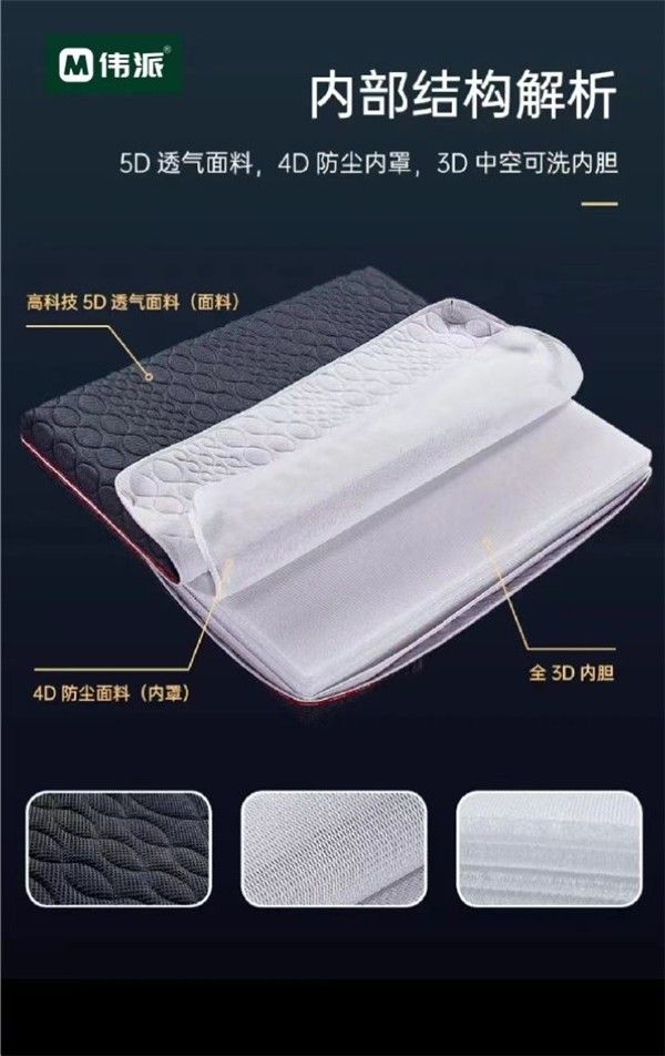 为了设计出一款满足用户需求,符合大众审美的全拆式可水洗安全床垫,“伟派”自上而下的每一位成员都在竭尽全力!成百上千个不眠之夜,成千上万次地技术测试,最终打磨出了伟派专属的独家设计。符合卧室风格,有助用户睡眠的深色沉稳风颜色设计、全拆式便于清洗清洁的贴心理念、5D透气面料,4D防尘面料(内罩),3D中空可洗内胆全新组合、可抽真空卷包且零压力高回弹的高新技术安全材质……我们所经历的所有不方便、不舒适、不习惯,只为让您更方便、更舒适、更习惯!优质的设计理念,让伟派,更气派!