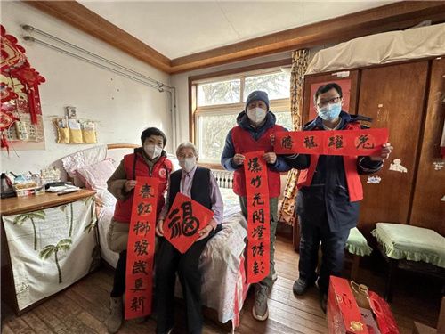 临走前,志愿者认真帮张奶奶张贴福字,提前为春节增添喜庆气氛。