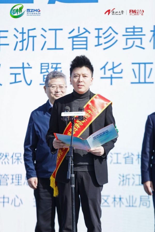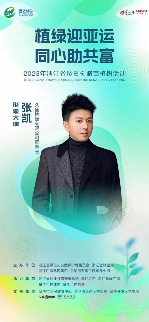 活动受到了社会各界广泛关注,久盛地板董事长兼总裁张凯先生特邀出席,并与皮划艇世界冠军许亚萍、浙江卫视主持人王帅、浙江之声主播方雨、全国十大苗木经纪人金华世轩园林董事长程伟达等4位嘉宾被授予2023年全省珍贵树赠苗植树活动形象大使称号。随后张凯先生宣读了倡议书,向社会呼吁:“栽下一棵树苗,成就一片绿色;以实际行动践行杭州亚运会‘绿色、智能、节俭、文明’的办会理念,共同助力亚运会碳中和。”