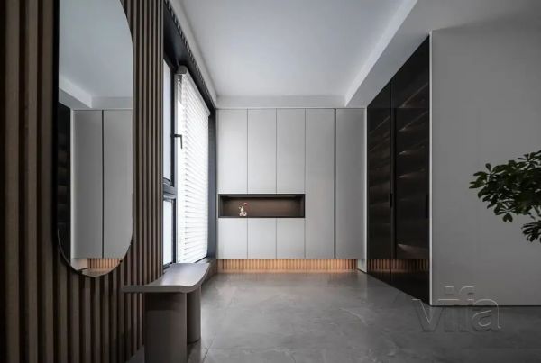 而对于多级物料的运用,也是行业当下的整体想象。几年间,板式极简展厅,由当年的单一物料,又回到了全屋定制的大池子里。