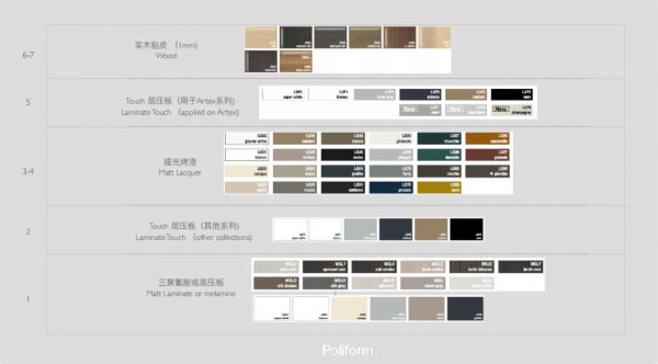 我们看看Poliform的物料表。从第一级的基础贴面板,到3MM化石橡木,都做了明确的规范。