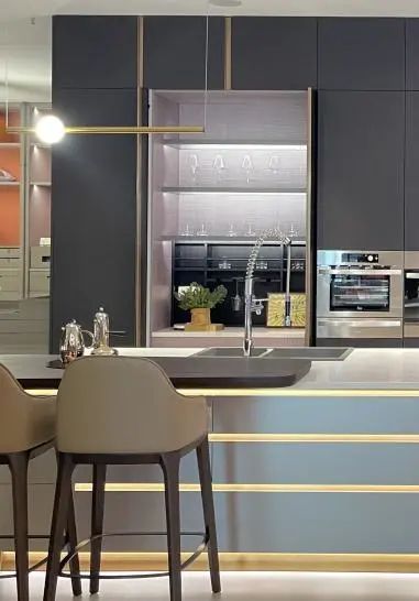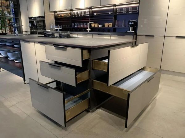 这款厨柜用了4种物料。中央导台面板由水性漆构成,通过长短不一的嵌入式拉手,可以感受到森美的严谨,上下左右全部低误差对缝。