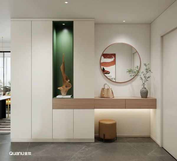 玄关处定制顶天立地式储物柜,超高门板流畅干练,造型简单大气。设计师用焦糖绿点缀开放格,抽象的艺术摆件带来别具一格的现代感。从柜体中延展出台面作为置物台,可随手放置包包等物品,墙面安装圆镜,方便出门前整理仪容,同时也达到了延伸空间的效果。