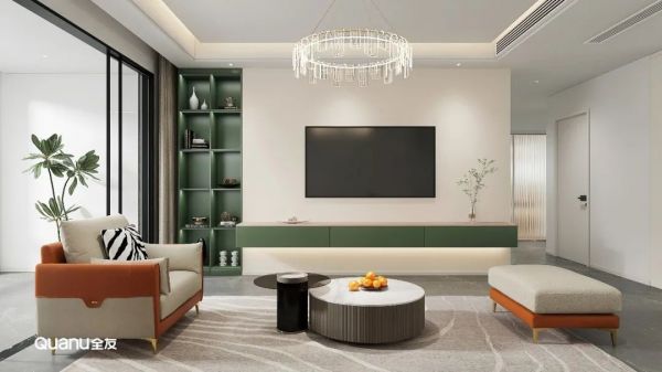 与传统美式风格不同的是,现代美式空间配色更加简洁自然。客厅以象牙白为主基调,电视墙定制开放格,同样以焦糖绿点缀其中,打破白色带来的单一感。橙色+米色真皮沙发,活泼跳色增强视觉效果,让空间更生动有趣。圆形吊灯与茶几造型相呼应,更具艺术气息。