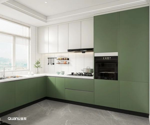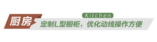 厨房是油污重地,所以在定制橱柜时,相较于白色,设计师选择了更耐脏的焦糖绿,留下吊柜采用白色门板,让厨房空间不显得那么压抑。“L型”设计动线合理,可以预留出更多操作空间,提高烹饪效率。