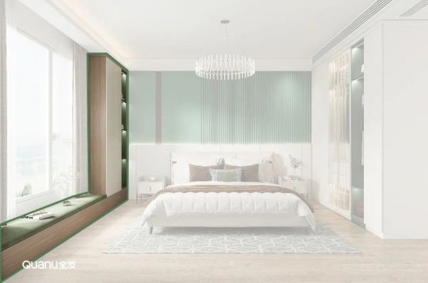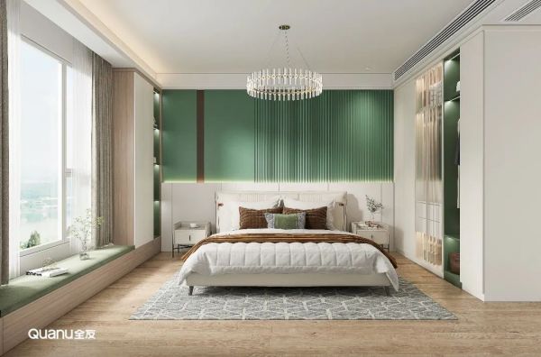 顶天立式衣柜带来超大容量,轻松容纳林女士夫妻二人的四季衣物;超高门板+透明玻璃+焦糖绿开放格,私密性与通透感并存,减少了全封闭式设计带来的厚重感。绿色栅格板装饰床头背景墙,内置灯带,层次分明,动态感十足。
