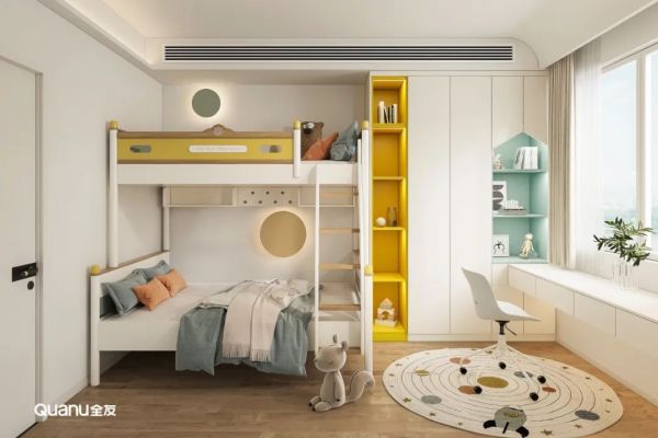 林女士的儿子正处于探索欲强烈的成长阶段,在儿童房购置高低床,下床用于休憩,上床成为小朋友的“秘密基地”。衣柜书桌一体式设计,满足孩子的收纳与学习需求。元气黄与晴空蓝做空间撞色点缀,活泼又清新,更适合小朋友居住。