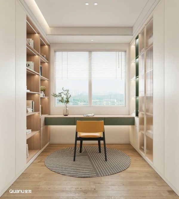 书房定制平行式书柜,左右墙面均利用,储物量丰富,半开放式设计让资料拿取更方便顺手。靠窗处定制台面作为书桌,自然光线充足。工作疲惫时远眺放松身心,劳逸结合,工作效率更高。