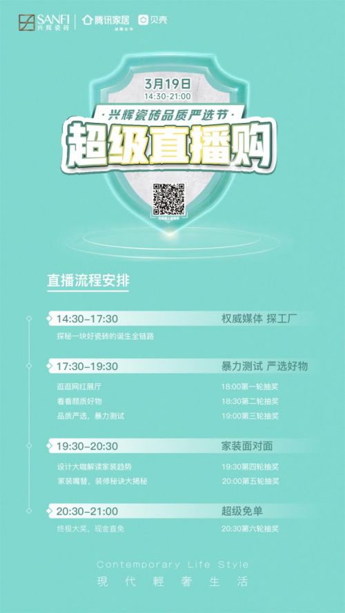 更多精彩内容,尽在3月19日14:30-21:00的兴辉瓷砖超级直播购!