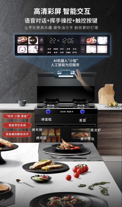2021年德希卡研发出第一台带空气净化功能的集成灶,带领集成灶行业进入守护清新厨房领域。2022年德希卡研发出第一台可语音操控蒸烤箱的集成灶,解放双手,带领集成灶行业正式进入智能时代。德希卡自主研发的智能语音集成灶搭载国内先进的语音技术,在可以用语音简单控制烟机模块的基础上,升级到可以直接用语音控制集成灶的蒸箱和烤箱,做到真正的解放双手,动动嘴就可以。
