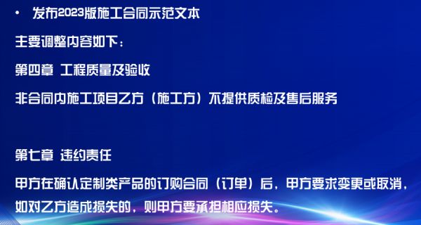 发布一:2023版施工合同示范文本。自2014年起,协会配合相关政府部门发布施工合同示范文本,示范合同的推广和运用极大地降低了装修甲乙双方的法律风险和隐患,为装修内容规范化做出极大贡献。协会针对去年“12345市民服务热线”中住宅装饰合同纠纷共性问题进行了汇总,通过征询多方意见,经法律顾问优化完善,在新版合同中进行部分条款的补充,调整内容将进一步明确甲乙双方的权责义务,避免因约定不明确造成的意见分歧和纠纷隐患。