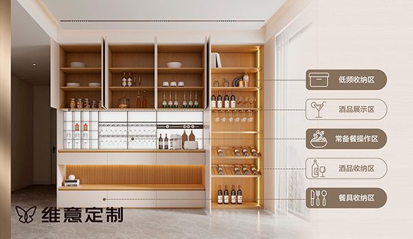 外观沿用块面分割的设计手法,满足餐厨用品的收纳,融入背发光背墙收纳系统,充分展现主人的生活品味。