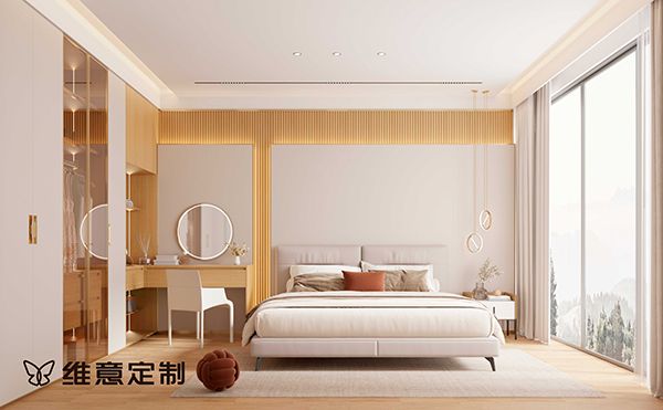 撞色点缀,营造温暖自然、年轻活力的卧房空间,高柜衣物收纳展示,完美实现美学与功能的融合。