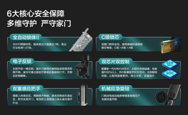 采用全新第二代自研超静音全自动锁体,外壳采用不锈钢,主锁舌能承受高达1吨的侧向静压力,高出行业标准1.67倍。全新设计降噪系统,整锁开门时安全快速且安静。室内面板分布着电子开锁、反锁按钮及应急旋钮。当从室内开门时,只需手持内把手,按动电子开锁键,便可快速解锁开门。