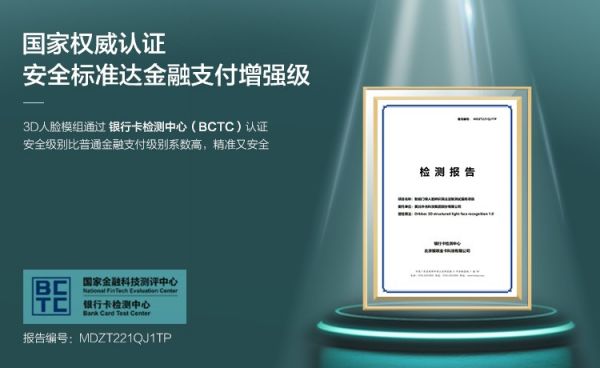 3D Depth Sensing的人脸识别模组通过银行卡检测中心(BCTC)认证,安全级别标准达金融支付增强级,精准且安全;平面照片、手机视频以及面具都是无法开锁的。