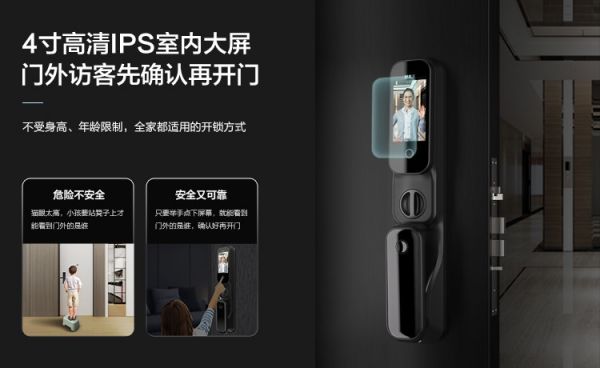 4寸高清室内彩屏&超静音全自动锁体:4寸IPS室内彩屏,高清钢化玻璃面板贴合,分辨率480*800,画质清晰更防刮蹭,平时可通过室内触摸按键主动唤醒查看,无需开门。同时可设置亮屏时间、交互式灯光操作。