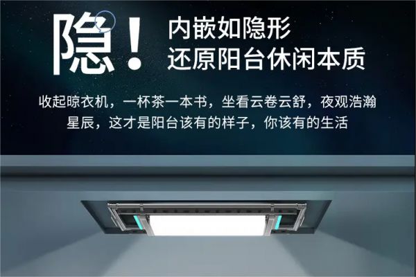 10CM级超薄整机:10cm整机厚度贴顶安装或嵌入安装,不挡内开窗,不改变原有家装,晾杆完全收起时,不阻挡曲面屏LED。内嵌如隐形,还原阳台休闲本质。