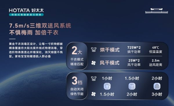 柔护干衣功能:7.5m/s三维送风系统高效干衣,烘干模式超大功率恒温烘干、风干双模式双倍风速大面积送风。三大柔护让衣物更易干,梅雨天气也无忧。