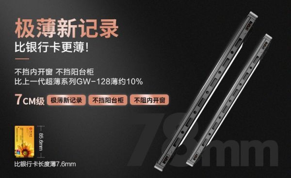 机身7CM级厚度:比银行卡更薄,是目前业内最纤薄的晾衣机,不阻内开窗,不挡阳台柜,比银行卡长度薄7.6mm。机身采用全金属,兼具硬度与强度,抗压抗弯曲,抗腐蚀性强,不惧洗涤剂残留侵蚀。