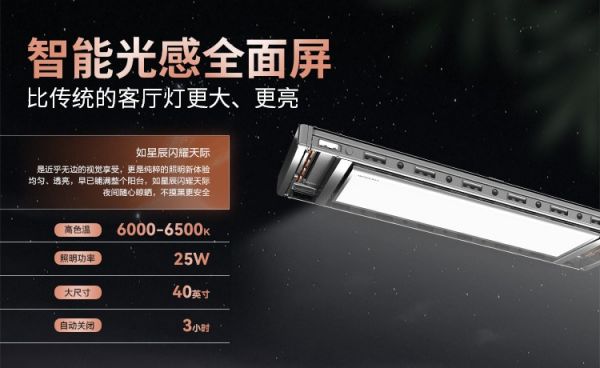 智能光感全面屏LED灯:40英寸大灯取代阳台灯,比传统阳台灯更亮。光度自由在APP进行调节;柔和护眼科技,开灯1秒内渐渐亮起,关灯1秒内渐渐暗下。
