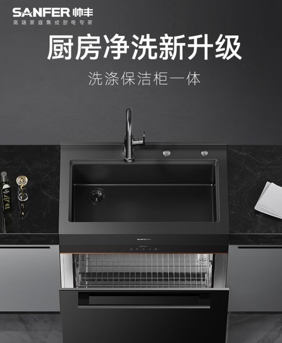 如果说T1-7B蒸烤一体集成灶通过超强性能解决了在烹饪中的各种烦扰,那么JS-W20集成水槽则将重点将集中在烹饪前和烹饪后。在集成水槽没上市之前,传统水槽仅担任了单一的洗漱功能,想要切菜还得转移阵地,对于厨房面积有限的家庭,洗漱区的利用率大大降低。同时传统水槽的双槽设计,在日常使用中其实并不方便,窄小浅的双槽,菜板锅具清洗根本放不下,洗完到处都湿哒哒。而帅丰JS-W20集成水槽,采用纳米星空灰镀钵大单槽设计,洗切一体,干湿分离,完美解决了台面地板积水与柜体长期泡水发霉的痛点。足够大的容量,还能轻松搞定菜板锅具冲洗,每天都可以给菜板洗个澡。下方双层设计的拉伸式保洁柜,140L超大容量,完美满足日常餐具的收纳需求。