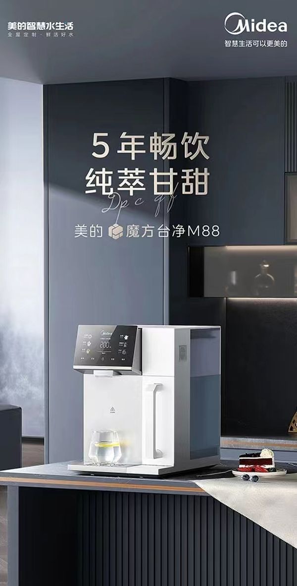 2023年,美的针对要冷热水同时满足,长效换芯和体验操作更简单,三大行业主流诉求,做出了“复合化、人性化、智能化”的功能和技术整合,设计出一款“5年长效、8°冰水、2种交互”的产品——“魔方台净”,陶氏膜+新研究水动该产品也是目前行业中,唯一一款既出冷水、又出热水、又带过滤的纯水机。
