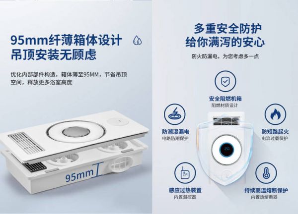 安全性是卡帕士浴霸的首要考量。卡帕士浴霸沐月02在安全方面全方位保障,采用阻燃材质机箱,有效防止火灾事故,而且拥有防电流过载保护和电路防潮保护,确保电器不受潮湿环境的影响。同时,沐月02内置温控器,通过感应过热设置和内置热熔断器进行保护,防止持续高温导致的意外危险。