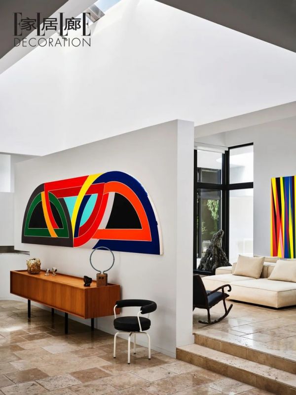 房子原有的大理石面隔板上摆放着艺术家Karin Gulbran的雕塑作品。休闲椅由Casey McCafferty设计,两幅艺术画作分别来自艺术家Cosimavon Bonin(左)和Albrecht Schnider。