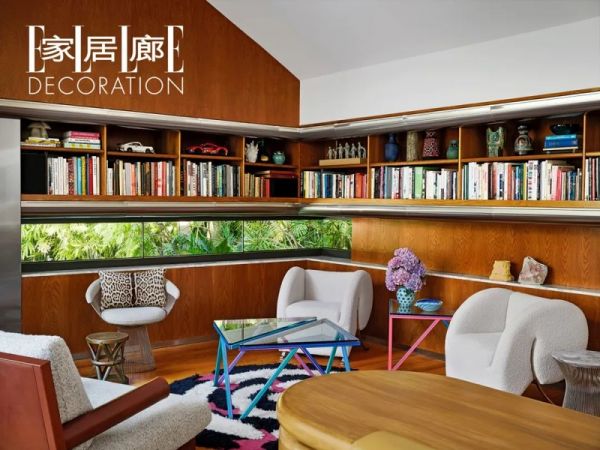 书房的设计灵感源于上世纪80年代的孟菲斯风格,使用明亮轻快的色彩搭配。鸡尾酒桌和边桌由Kelley Johnson设计,三把扶手椅分别来自B&BItalia(左)、Knoll(中)和Arflex(右),地毯来自Trenton Doyle Hancock。
