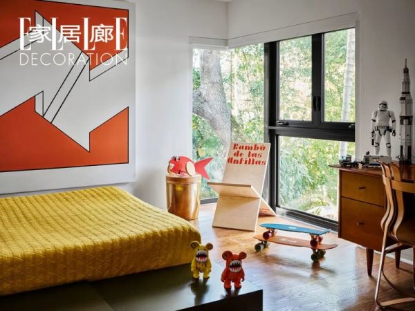 儿子的卧室中,椅子出自艺术家Rafael Domenech,而Alexander Calder的拖拉玩具则放在Target边桌上,床头上方陈列着Michael Smith的艺术作品。