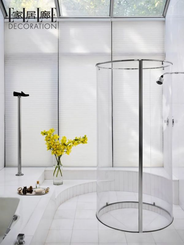 主浴室中淋浴间的有机玻璃是原有的。窗帘来自Hunter Douglas;鞋形雕塑(左)来自Andrew J.Greene。