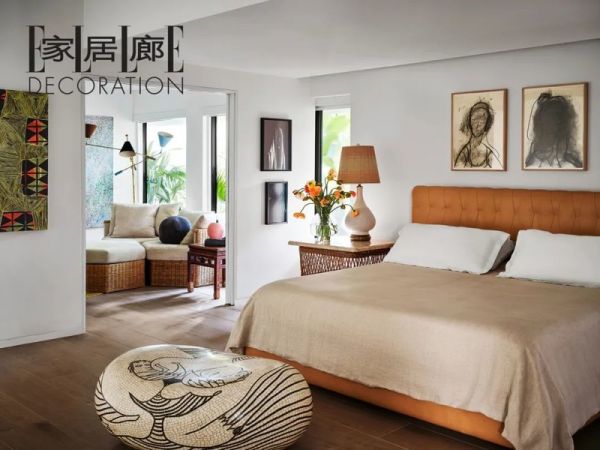 主卧室中,床脚处的雕塑来自艺术家Summer Wheat。复古边桌来自McGuire,床头的艺术作品由Grace Weaver创作。