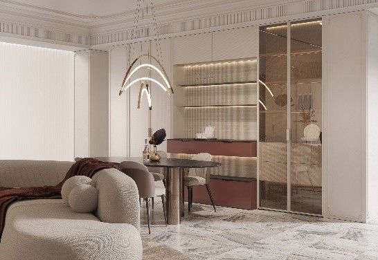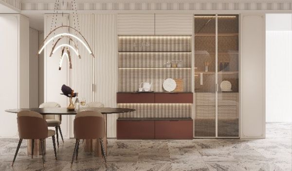 通 透 的 铝 框 玻 璃 门 碰 上 开 放 式 收 纳 层 板,兼 具 收 纳 与 展 示,延 伸 了 整 体 的 空 间 感 。 适 当 的 留 白 设 计,让 生 活 来 填 满,饱 含 对 美 好 生 活 的 期 许。