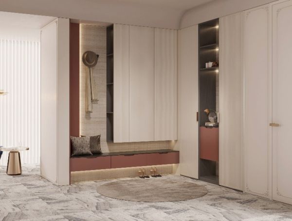 采 用 L 形 布 局,柔 和 色 彩 和 精 致 花 蔓 纹 理 提 升 入 户 空 间 质 感, 整 体 简 约 而 美 好,进 门 瞬 间 卸 下 一 身 疲 惫。