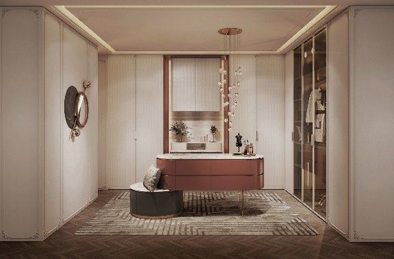大 面 积 的 柔 白 色 奠 定 了 温 柔 浪 漫 的 基 调,颇 具 质 感 的 细 节, 以 及 强 大 的 收 纳 力,诠 释 女 主 人 梦 想 中 的 专 属 衣 帽 空 间。