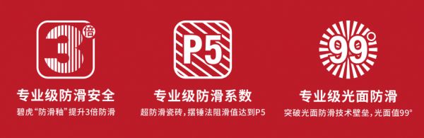 碧虎拥有多项国家防滑专利,掌握超防滑核心科技,是首席防滑专家。碧虎防滑大理石瓷砖与中国制釉集团(大鸿制釉)强强联手,共同研发专利釉料——碧虎 G5 超防滑釉料,产品防滑等级达到 P5,是防滑最i高级别,经国家工信部鉴定,达到国际先进水平。