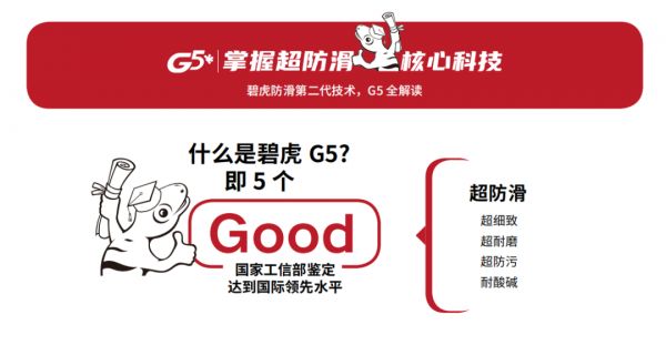碧虎第二代G5超防滑多功能瓷砖,不只是超防滑,防污能力达到5级,耐磨性能达到4级以上,兼具有超防滑、超耐污、超耐磨、超细腻、耐酸碱等优点,能够全方位解决消费者居家安全与清洁烦恼。