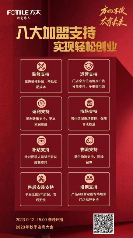 9月12日下午15:00,方心不改 太有未来 方太2023年秋季选商大会将正式拉开帷幕,活动现场不仅可9.9元锁定2023年VIP特权卡,更有八大加盟支持实现轻松创业,网易家居全程直播,敬请期待。