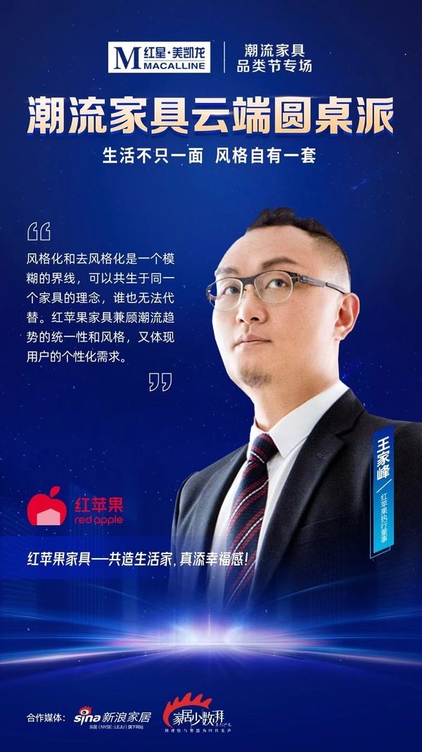 4月28日,由红星美凯龙主办的“潮流家具云端圆桌派”成功举行。活动以“生活不只一面,风格自有一套”作为主题。来自平台、行业头部品牌、权威媒体意见领袖等众多大咖进行深度思维碰撞,探索家具行业新趋势、新潮向。红苹果执行董事王家峰受邀出席对话论坛,并发表观点。