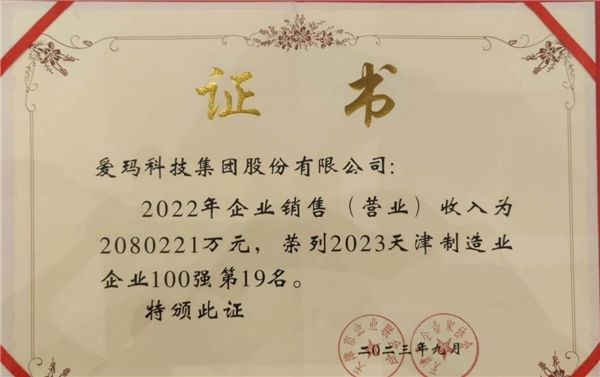 图:爱玛科技集团荣列2023天津制造业100强第19名