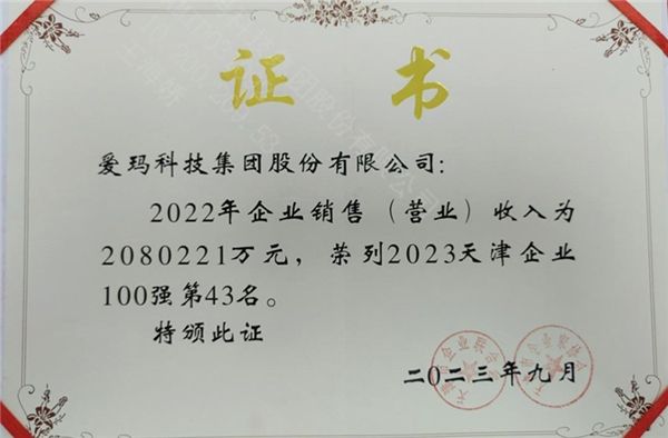图:爱玛科技集团荣列2023天津企业100强第43名