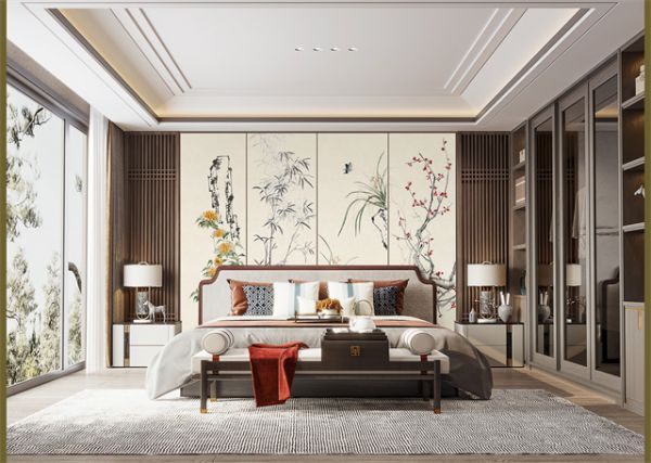 墙布上展现的梅兰竹菊等元素