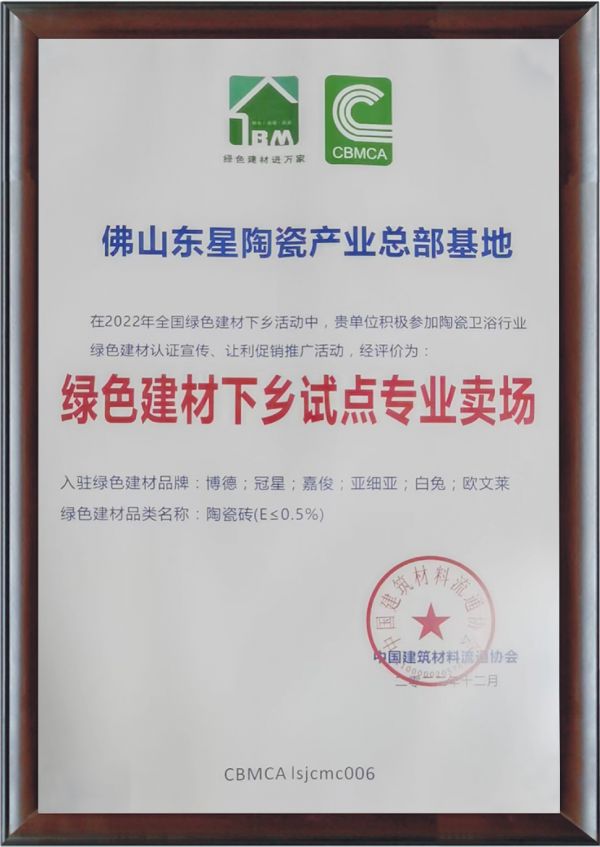 在工信部、住建部、农业部、商务部、国家市监总局、乡村振兴局等六部倡导的“绿色建材下乡”活动中,中国陶瓷总部积极响应国家政策要求,引导园区企业进行绿色产品认证、绿色建材产品分级认证,牵头开展围绕陶瓷卫浴及新材等绿色建材产品让利促销活动,激发群众参与活动的积极性。为此特评定中国陶瓷总部为“绿色建材下乡试点专业卖场”,