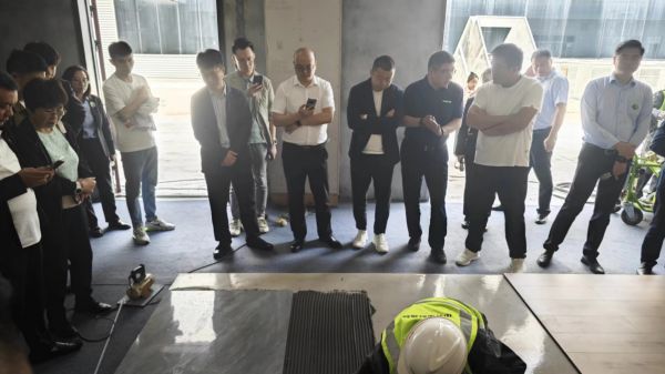 在参观过程中,中联重科集团副总裁、中联重科新材料董事长陈培亮以及中联重科相关工作人员向参观者们进行细致产品讲解,包括“自流精找平、地暖高导热、薄贴不空鼓”的高流动性地坪砂浆;德国技术,环保品质,纯无机、无甲醛、零VOC”的无机艺术壁材……除此之外,中联新材还借由现场作业生动地展示了新材料、新装备、新技术。