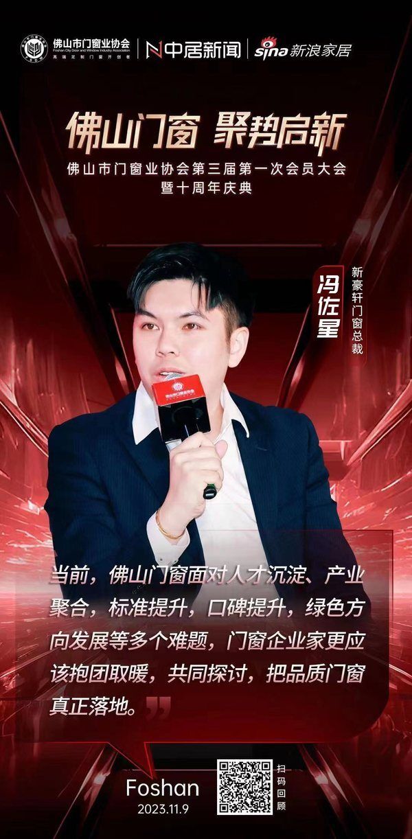 11月9日,“佛山门窗·聚势启新——佛山市门窗业协会第三届第一次会员大会暨十周年庆典”在佛山举办。在论坛环节中,新豪轩门窗总裁冯佐星表示,当前,佛山门窗面对人才沉淀、产业聚合,标准提升,口碑提升,绿色方向发展等多个难题,门窗企业家更应该抱团取暖,共同探讨,把品质门窗真正落地。