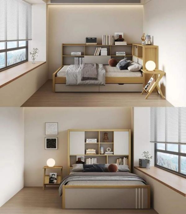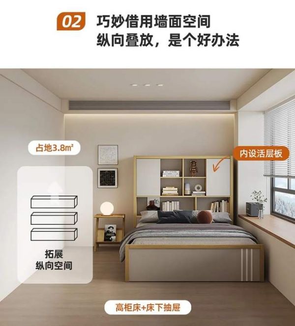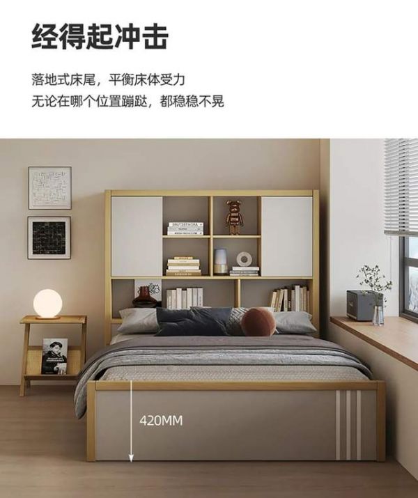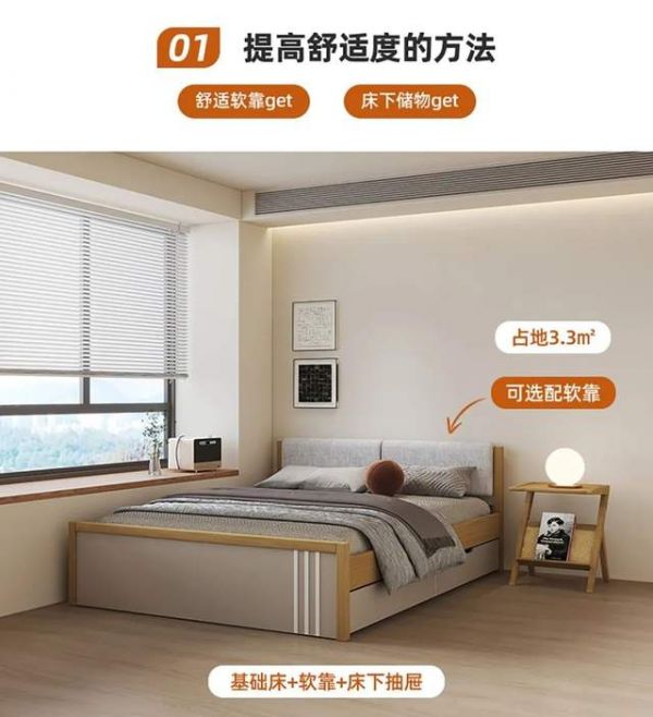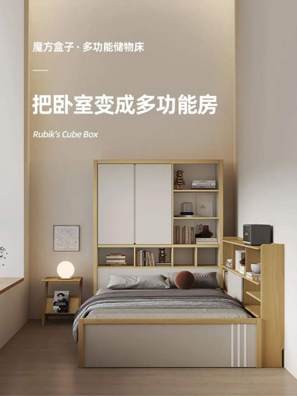 1⃣️卧室有点小,放一个衣柜会很挤,但有需要有收纳的空间。☑️选择自带储物功能的魔方盒子实木床系列很合适,纵向拓展空间使用率。