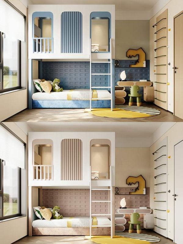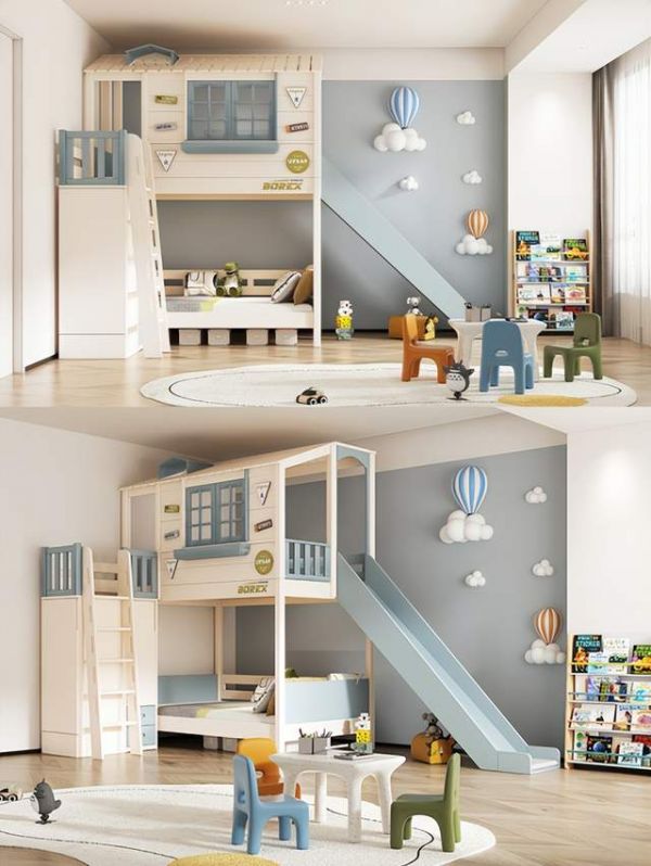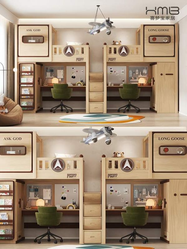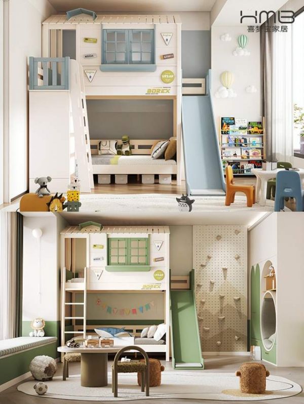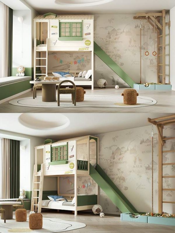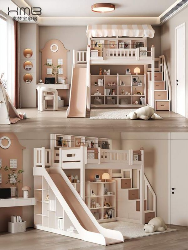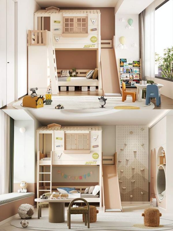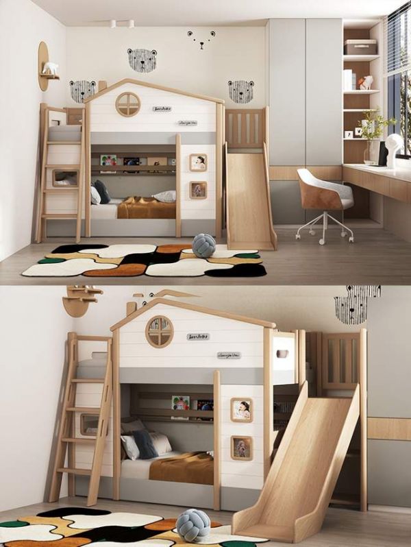 布置一间适合自己家的儿童房首先你要考虑自己宝宝的年龄需求,其次要参考自己家的户型情况。-对于10平以下小户型,每一寸空间都要利用的淋漓尽致~儿童房功能分区休息区:选择上下床或侧边储物多功能床,纵向利用空间,创意小屋造型让孩子有自己的秘密基地,配套的滑梯挂梯,欢乐有趣,给孩子们一个美好的童年。
