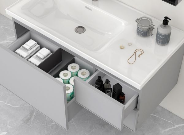 大容量储物空间:HFL0708致简系列浴室柜拥有大容量储物空间,台面和镜箱都可以轻松收纳你的洗浴用品和化妆品。主柜体收纳设计采用抽屉式设计方式,侧边具备收纳平台,容量大,分类清晰。镜箱收纳更设计了女士专属空间,在镜箱内部增加美妆收纳模块,底部设有洁面巾抽口,让你的浴室更加整洁、有序。