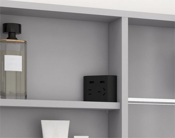 人性化设计:这款浴室柜还配备了按压式开门、化妆镜、镜箱充电功能等,让你的使用体验更加舒适、安全。镜箱内置增加插座设计(5孔+2USB),安全电压可匹配吹风机、电动牙刷、手机等充电需求,让您的卫浴生活保持“满电”。