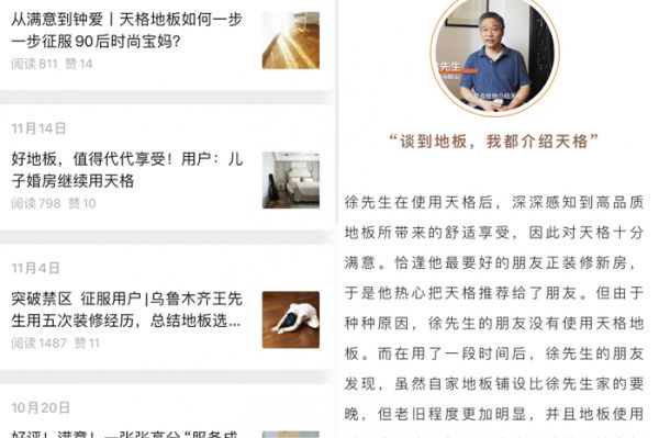 打开“天格地暖实木地板”微信公众号(以下简称“官微”),翻阅以往发布的内容,可以看到有超过一半的内容,都集中在真实用户的口碑方面。如“从满意到钟爱|天格地板如何一步一步征服90后时尚宝妈?”、“好地板,值得代代享受!用户:儿子婚房继续用天格”、“突破禁区、征服用户|乌鲁木齐王先生用五次装修经历,总结地板选天格的三大理由”.......从传播角度可以看出,天格地板的传播并没有止步于高大上的官方内容,但却用一个个真实的案例,通过用户的真实采访,传达出天格“以用户为中心”的品牌理念。